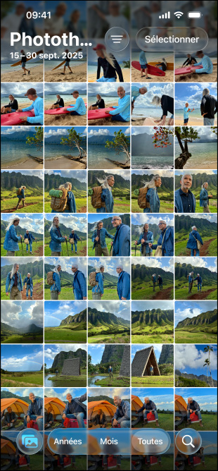iPhone dix-sept-e, vue avant, montrant une collection de photos dans la photothèque