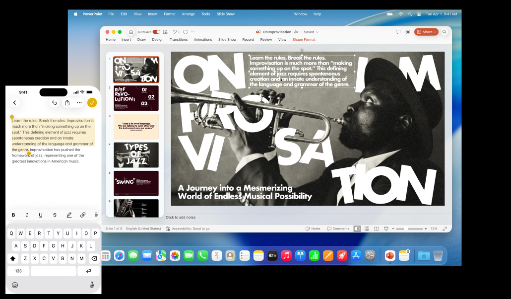 Un iPhone 16 Plus con texto resaltado en la app Notas, un Macbook Air de 13 pulgadas con una diapositiva de Keynote abierta, el texto de la app Notas aparece en la diapositiva