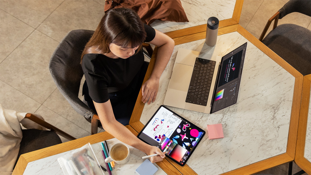Ideas come to her in parks, coffee shops — anywhere and at any moment, Suwara says. Voice Memos on iPhone help her capture her thoughts. Later, she sketches out her ideas with Apple Pencil on iPad and creates final compositions using Adobe Creative Suite on MacBook.