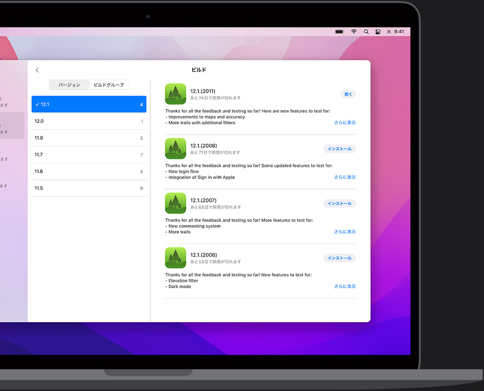あらゆる Apple製 デバイスで アプリを 公開する 準備を、 TestFlightで。 Macでも使えます。