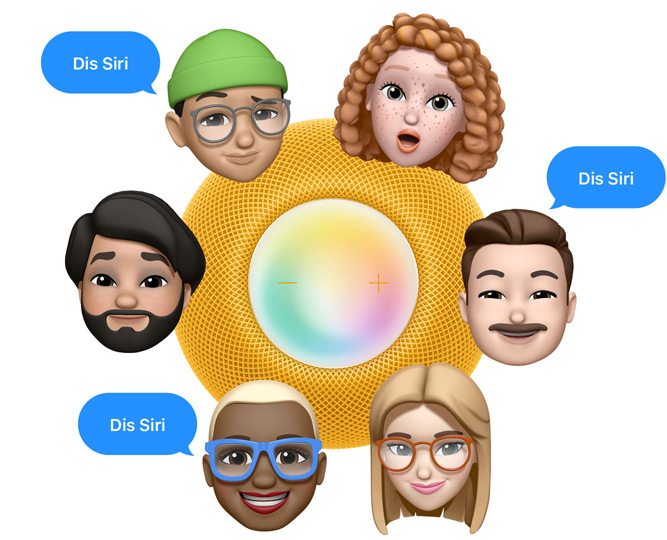 Six visages Memoji différents sont disposés autour d’un HomePod mini jaune vu du dessus. Six personnages disent « Dis Siri » dans des bulles bleues.