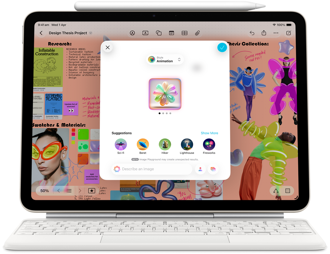 Landscape view of iPad Air showcasing Apple Intelligence with Image Playground, and Keynote, Apple Pencil Pro