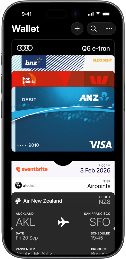 • Apple Wallet is an app on iPhone and Apple Watch that securely and conveniently organises your credit and debit cards, boarding passes, tickets, keys, rewards cards and more — all in one place.
