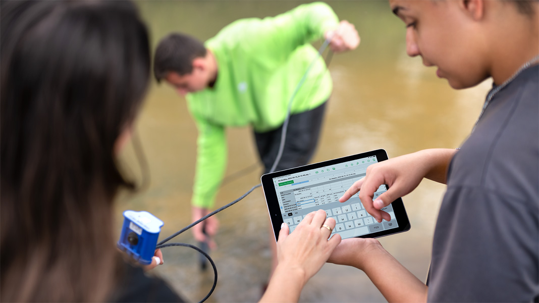 Taking their learning outside, an environmental science class went to a nearby river to investigate their local water supply. They brought iPad and wireless sensors to collect data about water quality, captured videos to document their experiences, and created a Keynote presentation to share their findings with the local government.