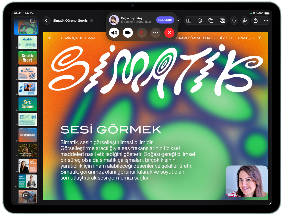 iPad Air, ön dış yüzey, kullanıcı FaceTime kullanırken Keynote uygulamasına bakıyor, arkasında diğer bir iPad Air, arka dış yüzey