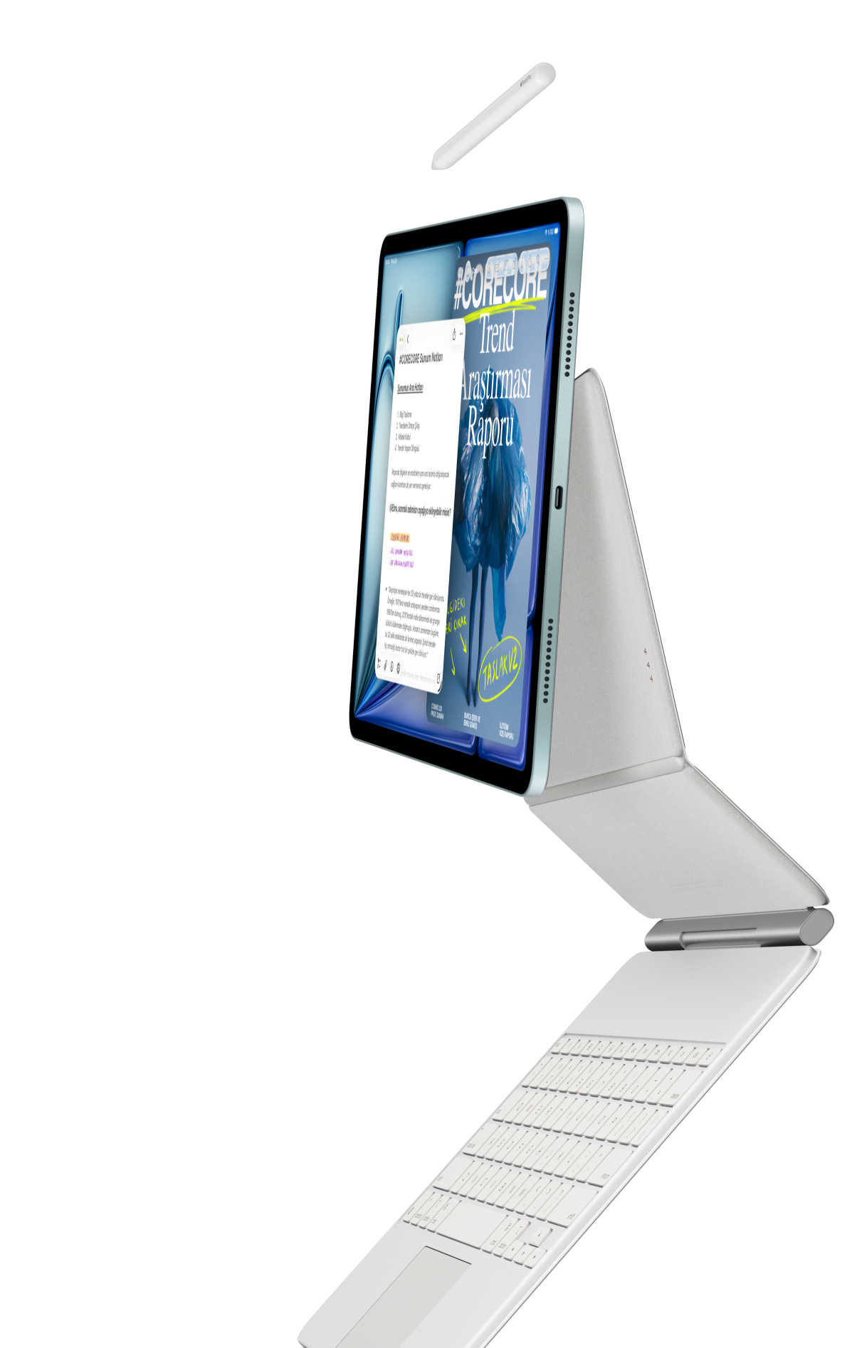 Siyah ve beyaz renk seçenekleriyle sunulan Magic Keyboard, iPad Air için mükemmel bir yol arkadaşı. Zarif ve portatif tasarımıyla hassas görevlerde muhteşem bir yazma ve trackpad deneyimi sunuyor. Klavye; 14 tuşlu işlev tuşu sırasına, eşzamanlı şarj özelliği için bir adet USB‑C konnektörüne ve iPad Air’iniz için ön ve arka korumaya sahip. Havada tutan askı modeli tasarımı, birden çok görüntüleme açısına kolayca ayarlanabiliyor ve geniş cam trackpad, iPadOS’te çalışmanın farklı yollarını sunuyor.2