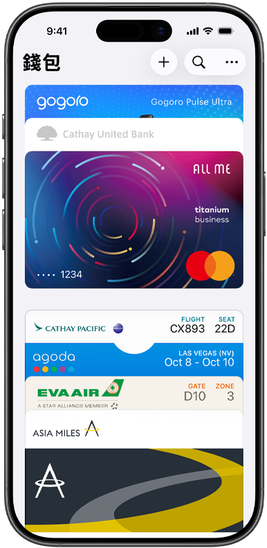 錢包該有的,全都有。 你的信用卡、簽帳金融卡、登機證、票券與酬賓卡,甚至連機車鑰匙等,都能放在「錢包」app 中2。只要以 iPhone 或 Apple Watch 就能使用,因此隨身攜帶的東西更少,能做的卻更多3。