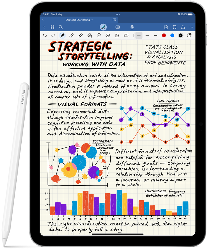 Image of Apple Pencil Pro and Apple Pencil USB-C next to multiple iPad devices displaying examples of handwritten notes and colourful illustrations created with Apple Pencil.