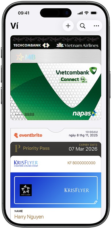 Thiết lập trong nháy mắt. Ngay trên iPhone của bạn. Apple Pay được tích hợp sẵn trong iPhone, Apple Watch, máy Mac và iPad. Để bắt đầu trên iPhone, mở ứng dụng Ví và chạm vào biểu tượng dấu cộng. Bạn sẽ có tùy chọn thêm thẻ vào các thiết bị khác của mình cùng một lúc. Khi bạn muốn thanh toán, chỉ cần nhấn đúp, chạm, và thế là xong. Bạn vẫn nhận được điểm thưởng và lợi ích từ thẻ của mình, nhờ đó bạn sẽ không bỏ lỡ bất kỳ điểm thưởng hay dặm thưởng nào.